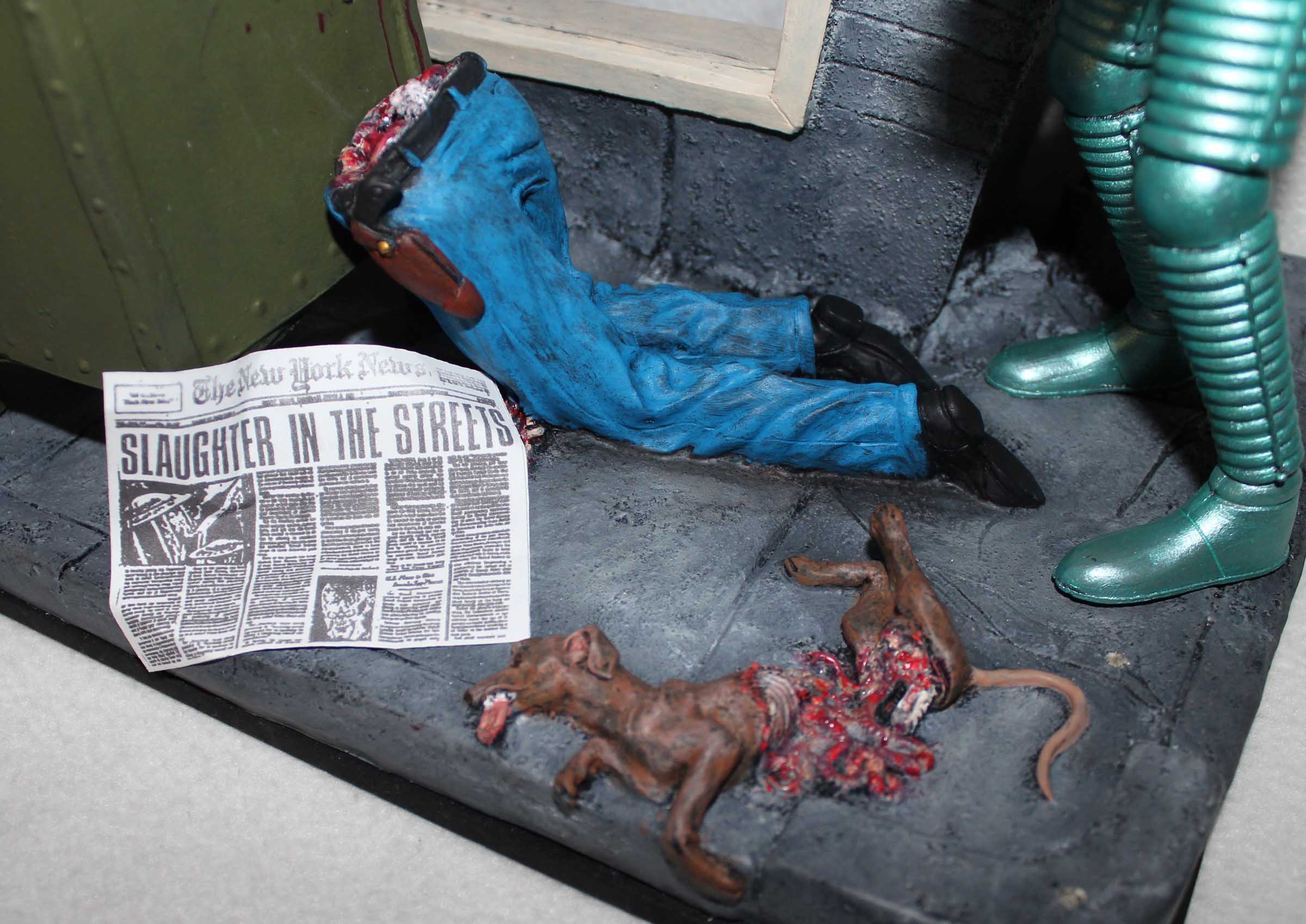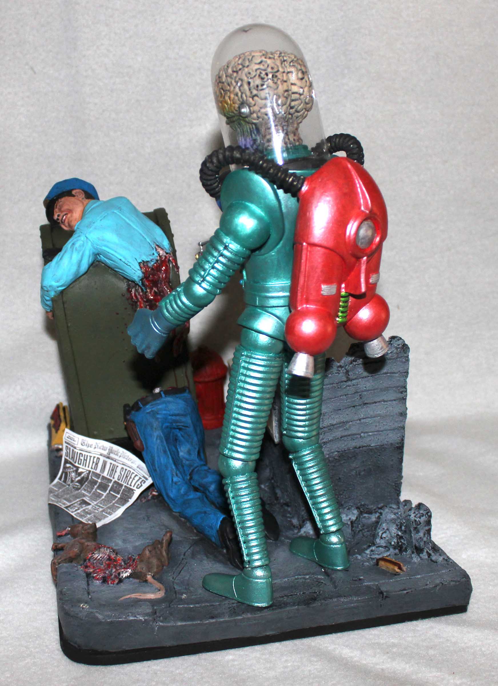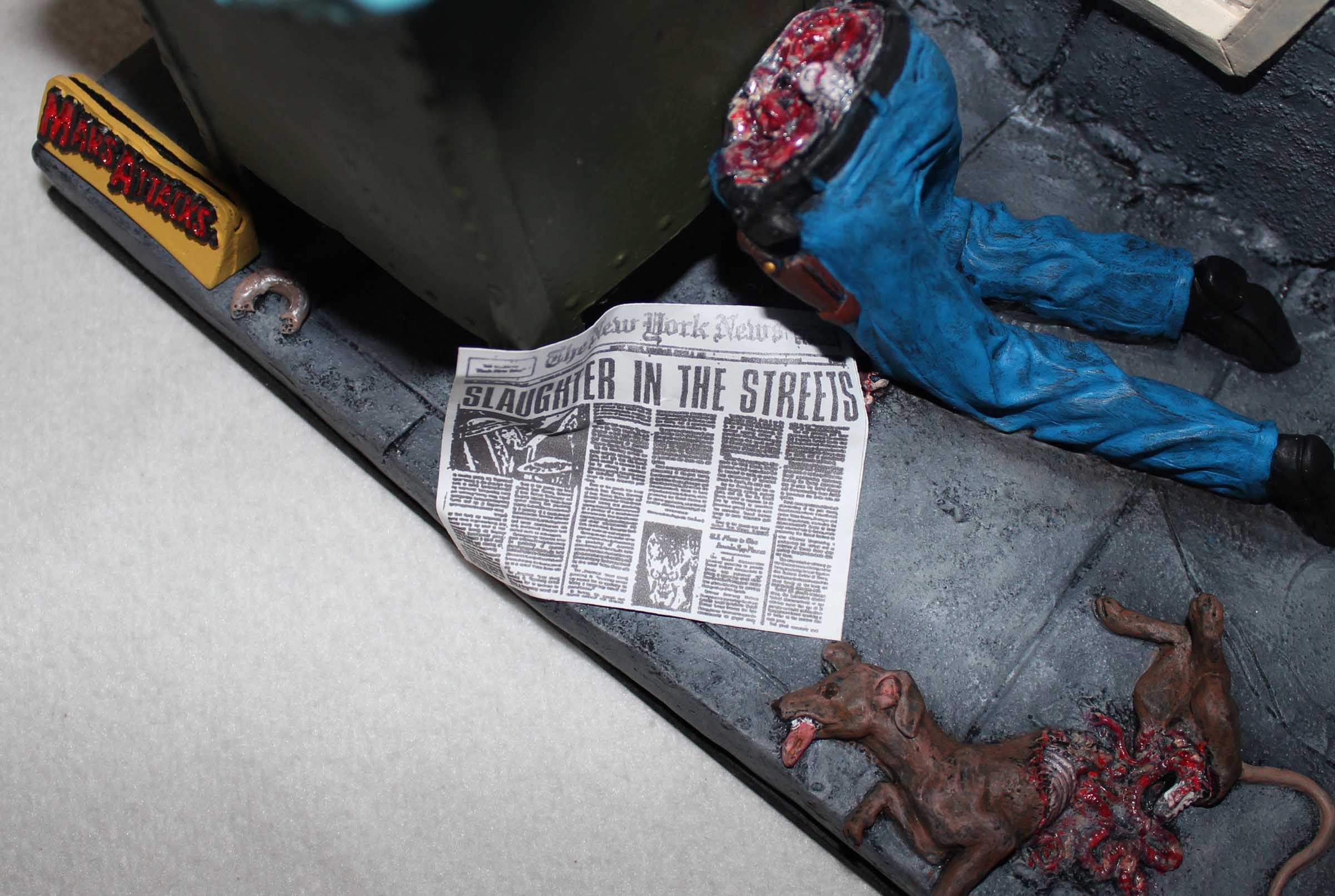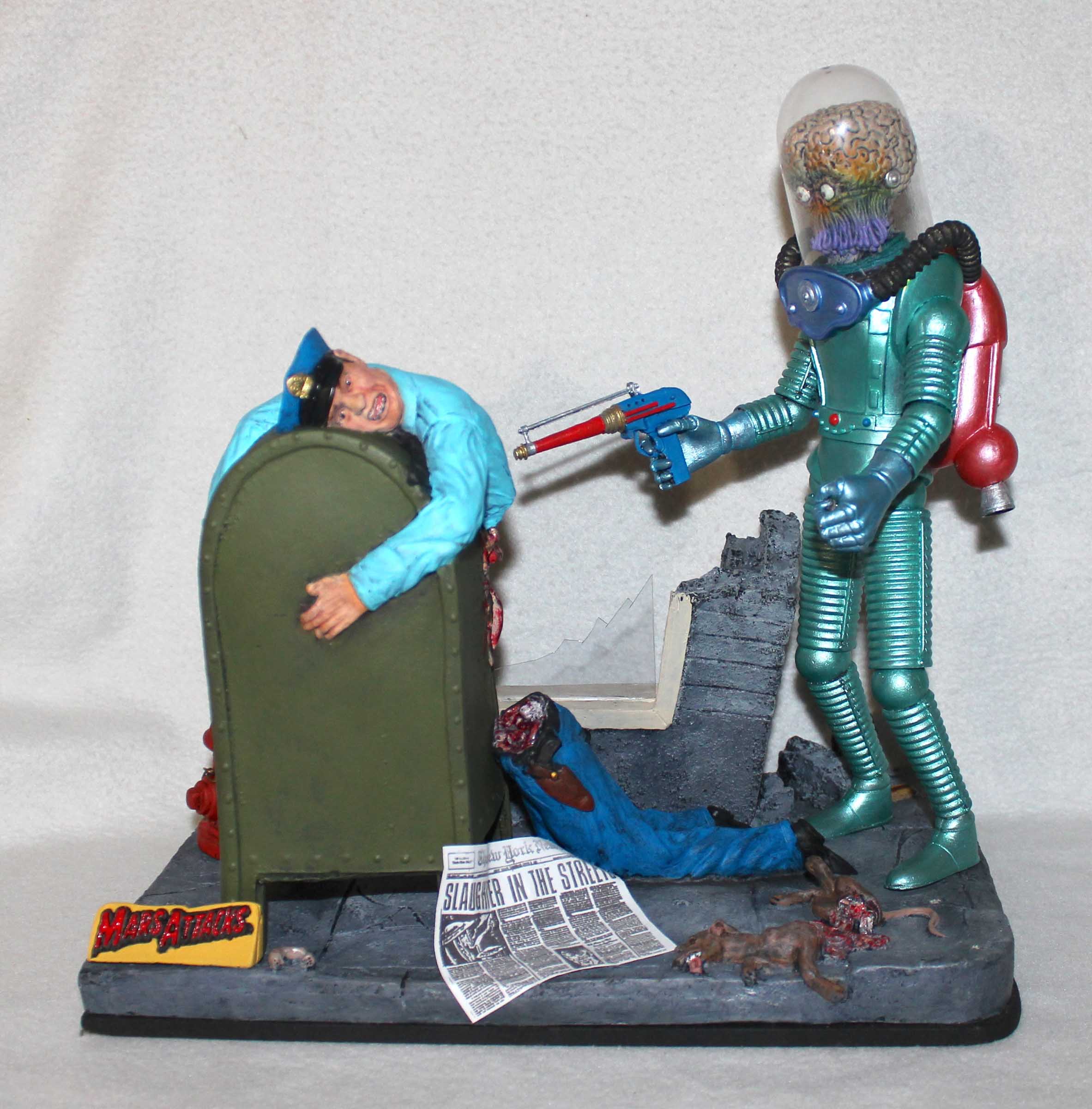 From Screamin! comes this diorama of a scene from Mars Attacks! This is a mixed media diorama. The base and mailbox are vinyl, the Martian and fire hydrate are resin, the helmet and broken window are plastic, and the newspaper is, well, paper. To support the hollow base it was filled with plaster. The mailbox was filled with expanding foam to provide support. All paints are acrylics.