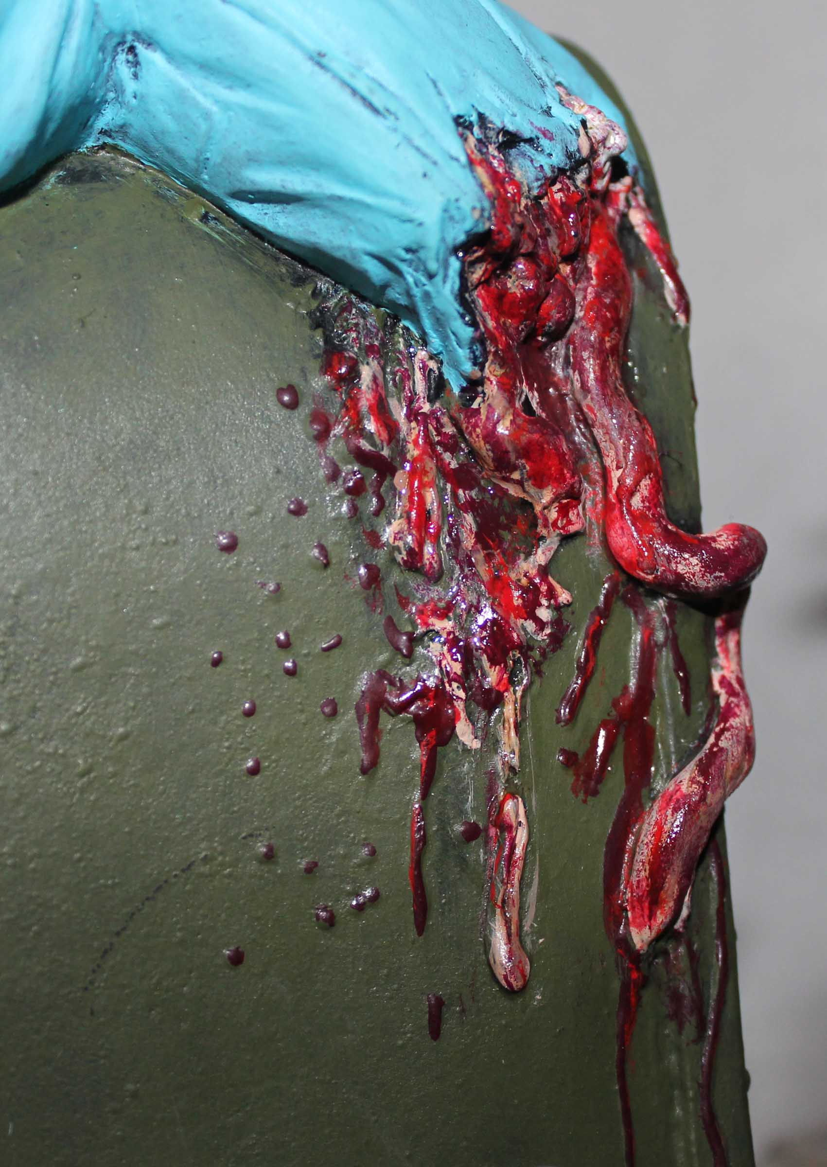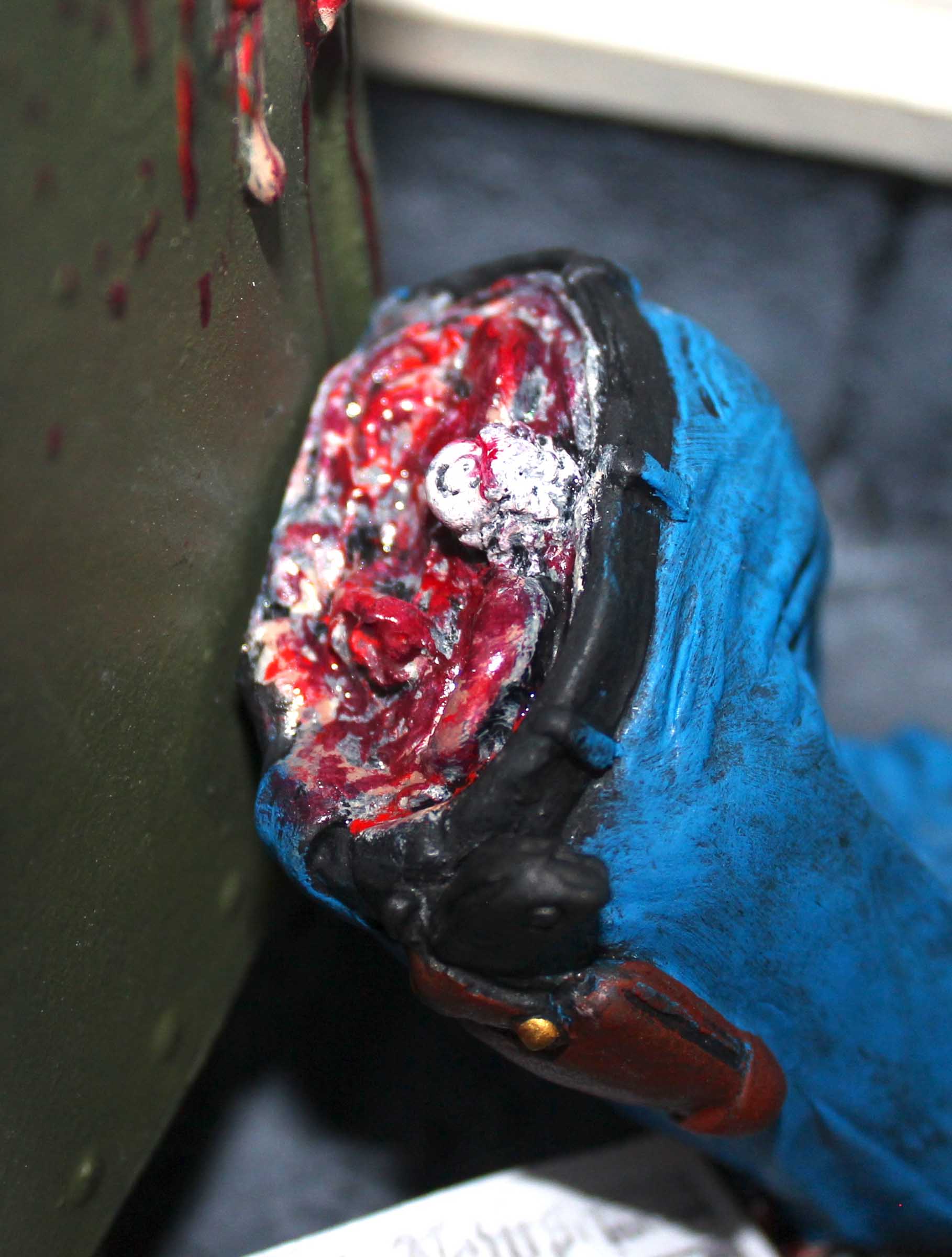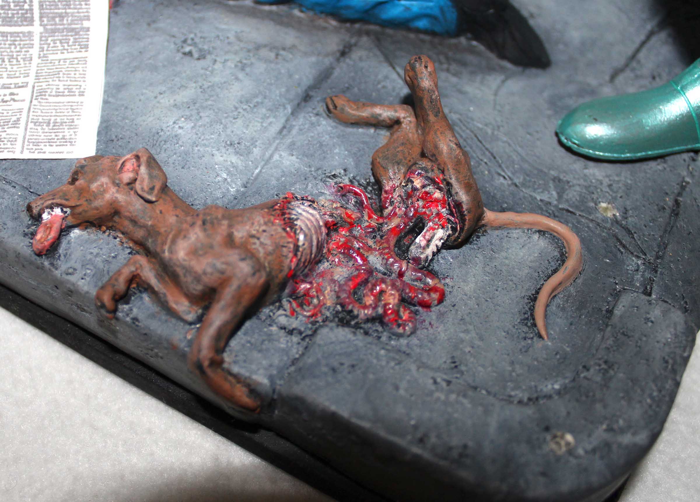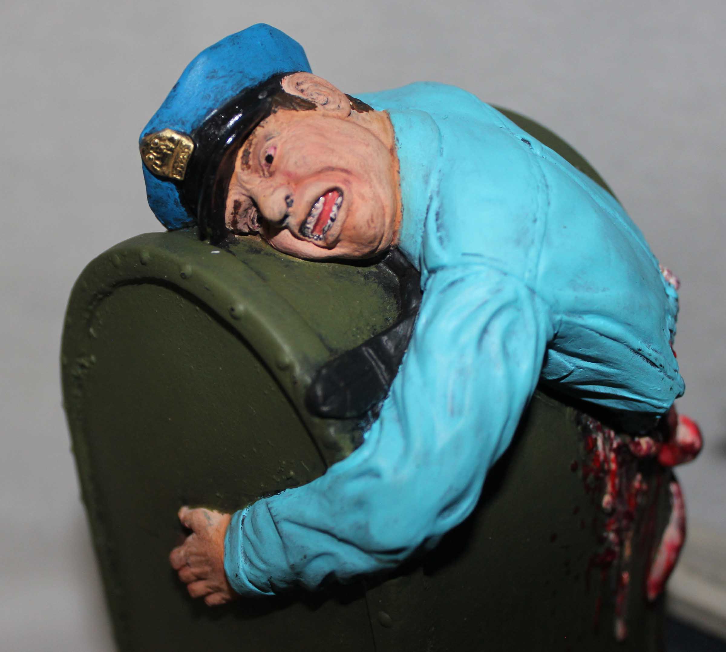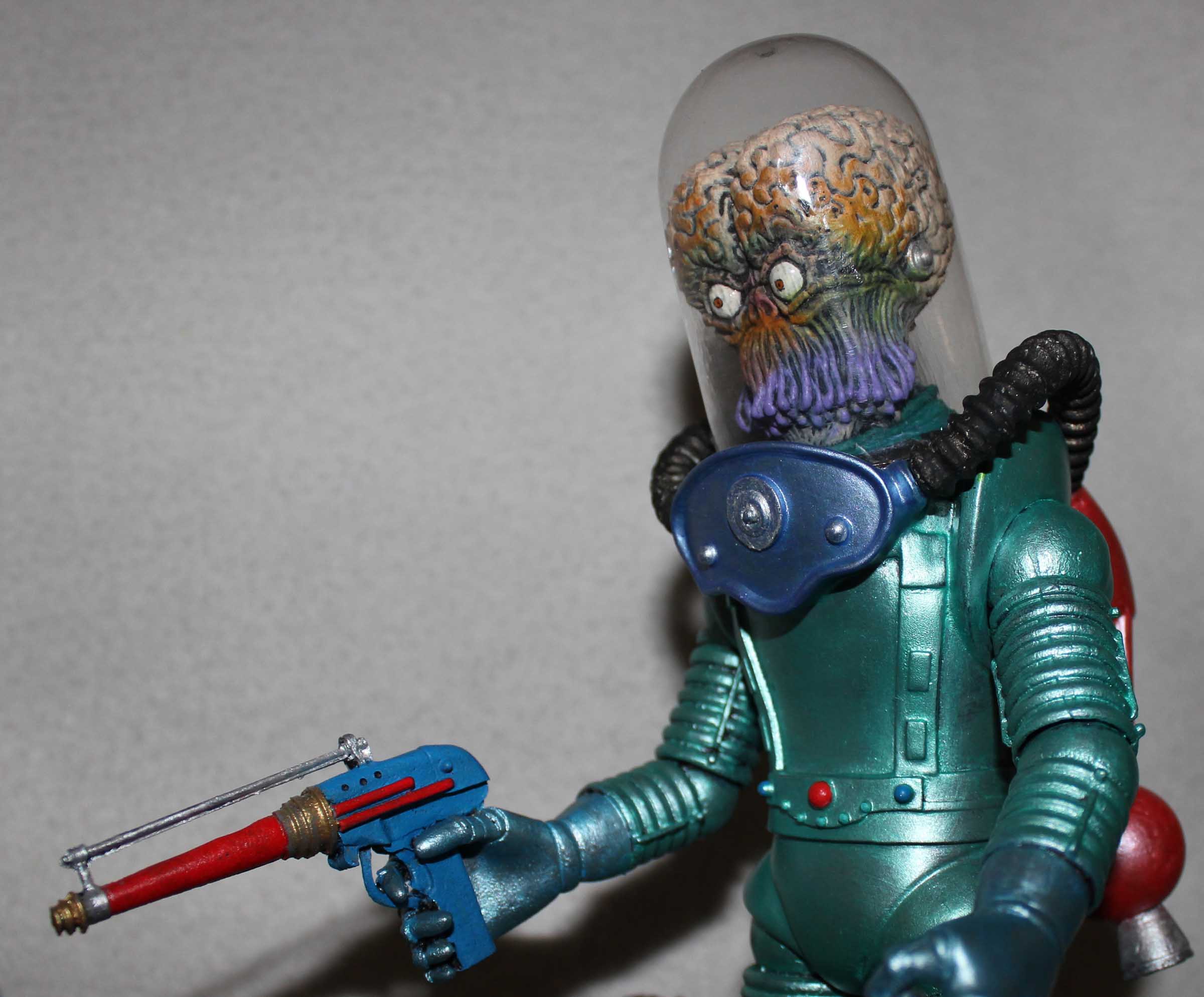 From Screamin! comes this diorama of a scene from Mars Attacks! This is a mixed media diorama. The base and mailbox are vinyl, the Martian and fire hydrate are resin, the helmet and broken window are plastic, and the newspaper is, well, paper. To support the hollow base it was filled with plaster. The mailbox was filled with expanding foam to provide support. All paints are acrylics.