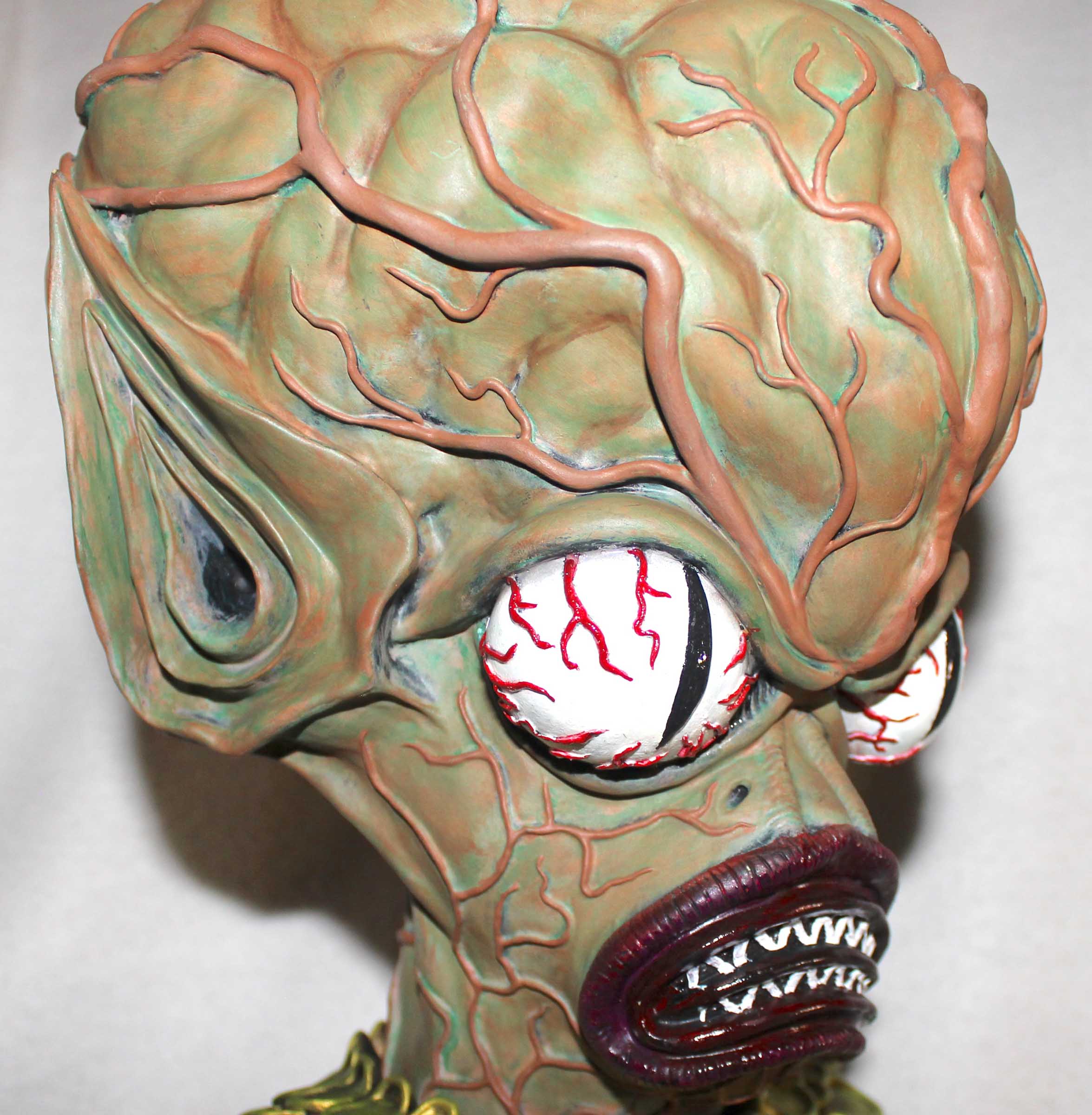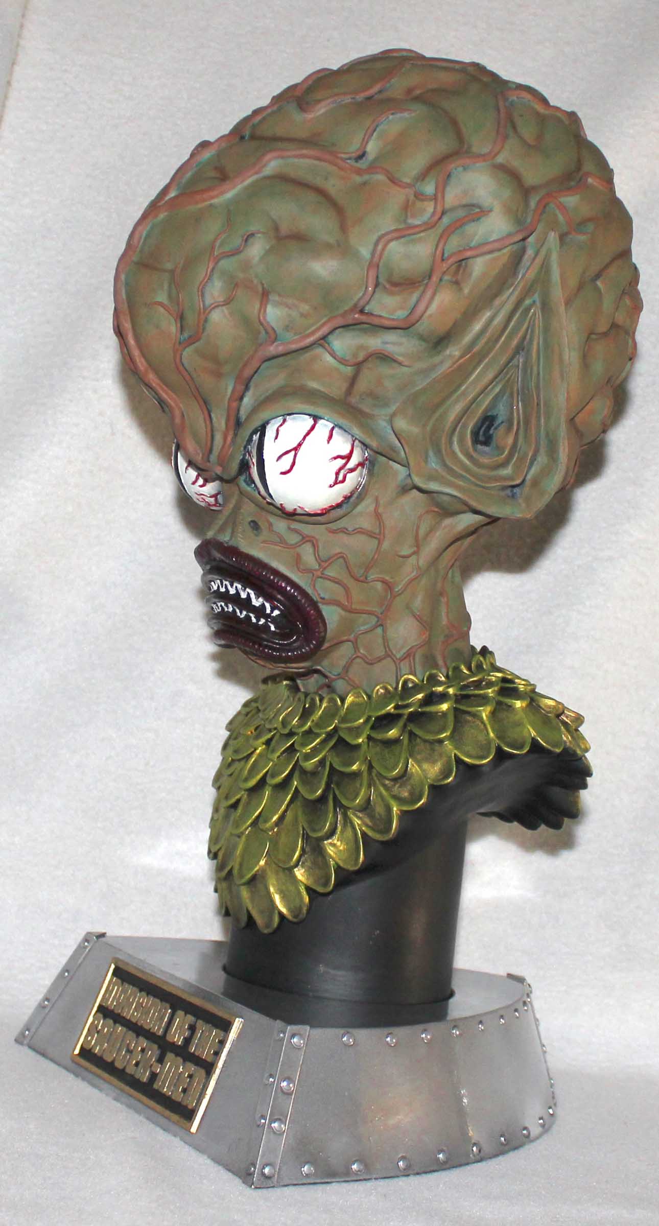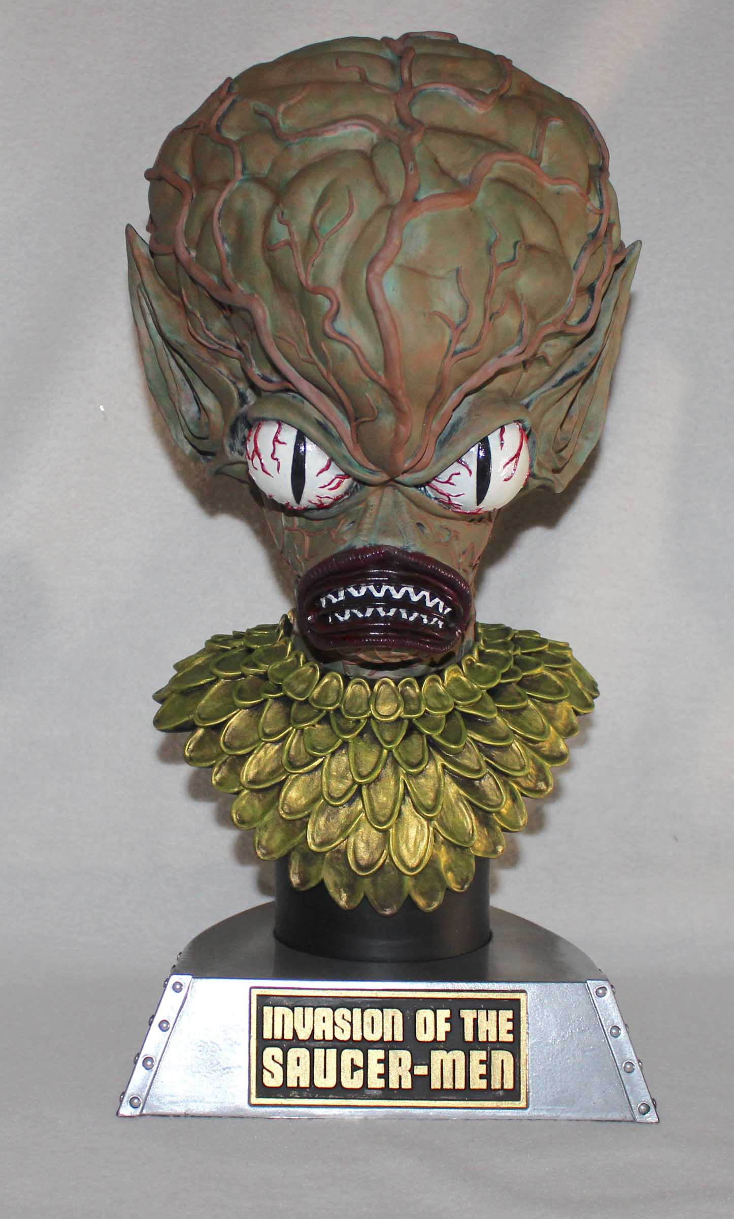 From Earth Bound Studios and sculptor, Steve West, is a 1/2 scale resin Big Head from the film, Invasion of the Saucer-Men.  The original design of the Martian was done by Paul Blaisdell and what bug-eyed monsters are all about.  Included with the bust is a severed hand.  All paints are acrylics.