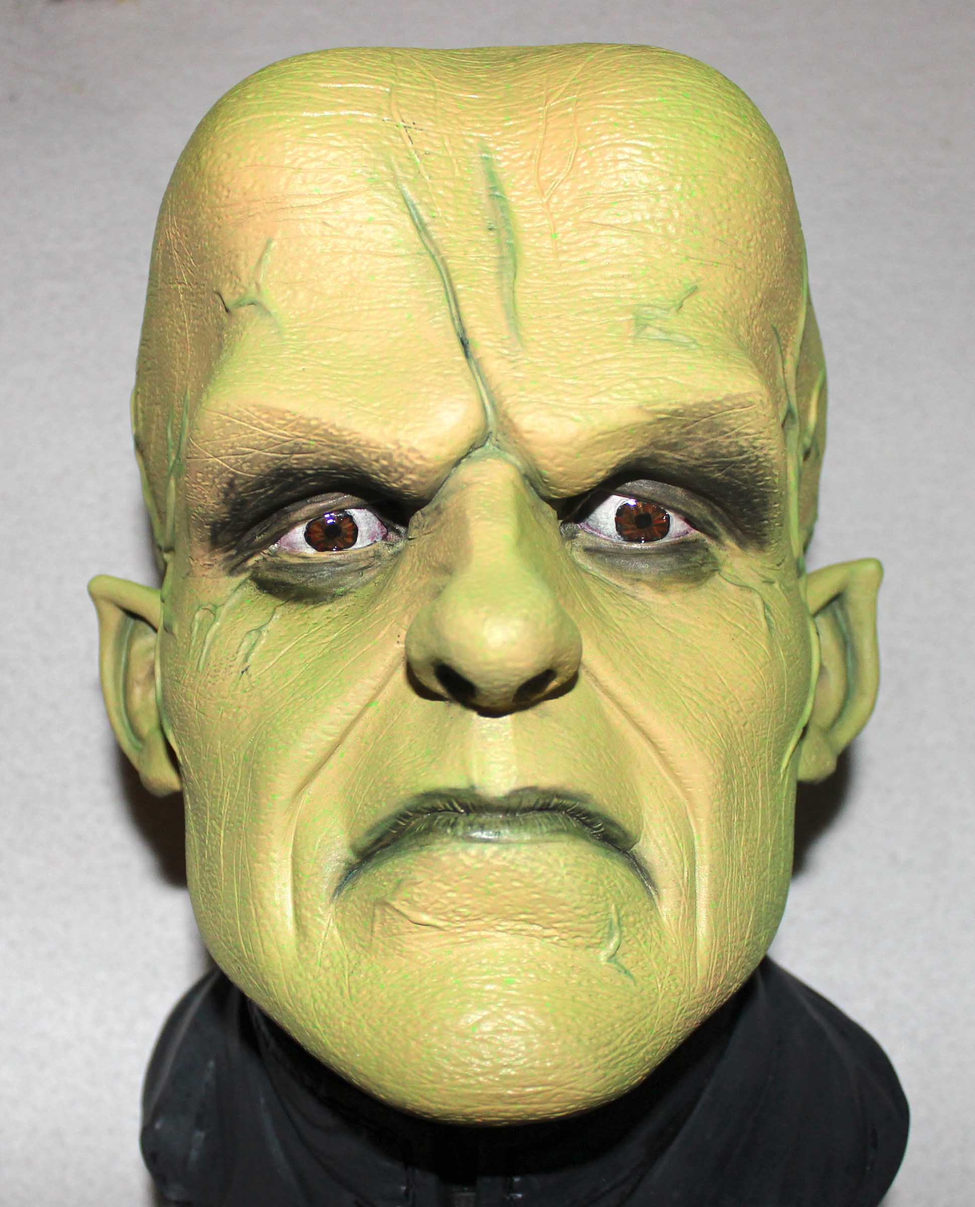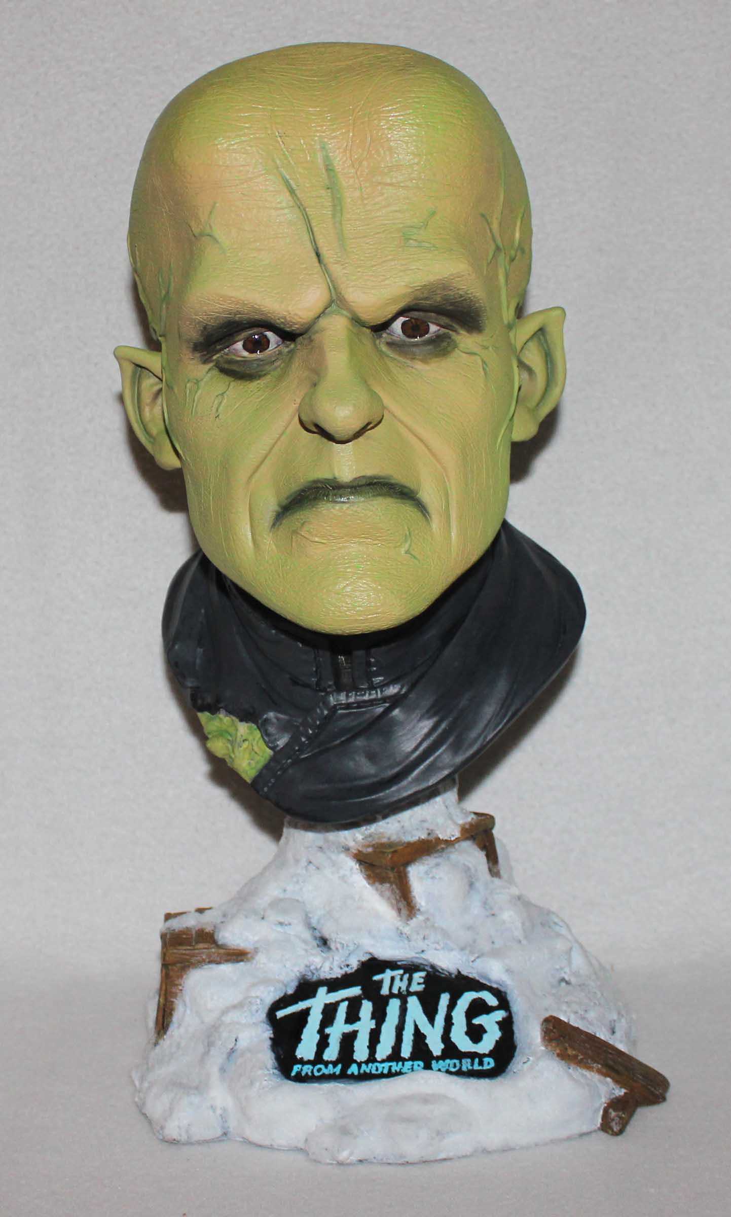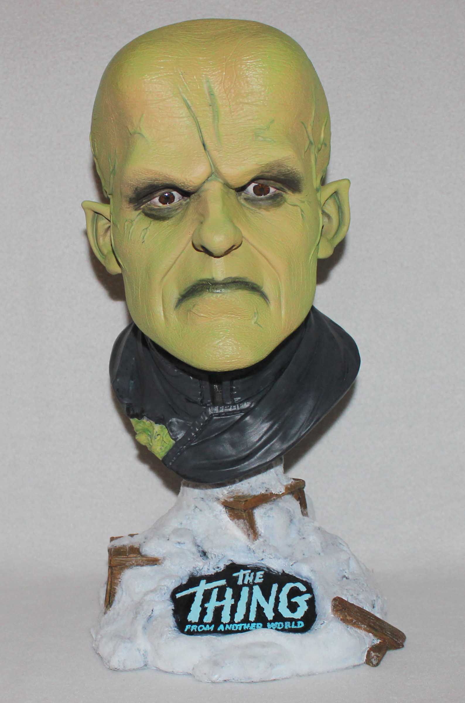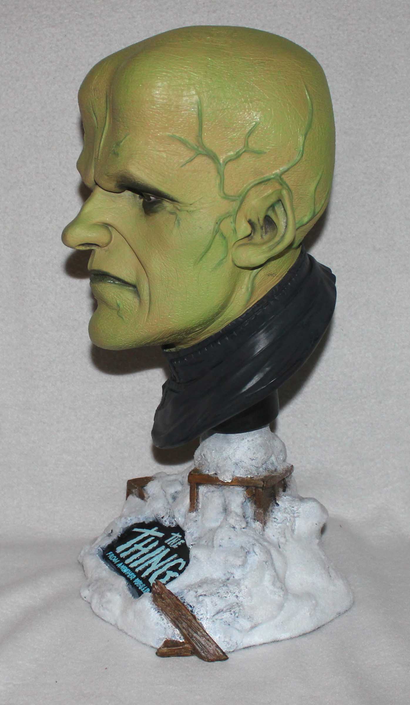 From Earth Bound Studios comes this 3/4th scale resin bust of James Arness as The Thing From Another World. Instead of the usual caucasian flesh tone I thought that the creature being vegetable would have a bit of green to his skin. For the base I brushed on glue and sprinkled Woodland Scenics snow over it. All paints are acrylics.