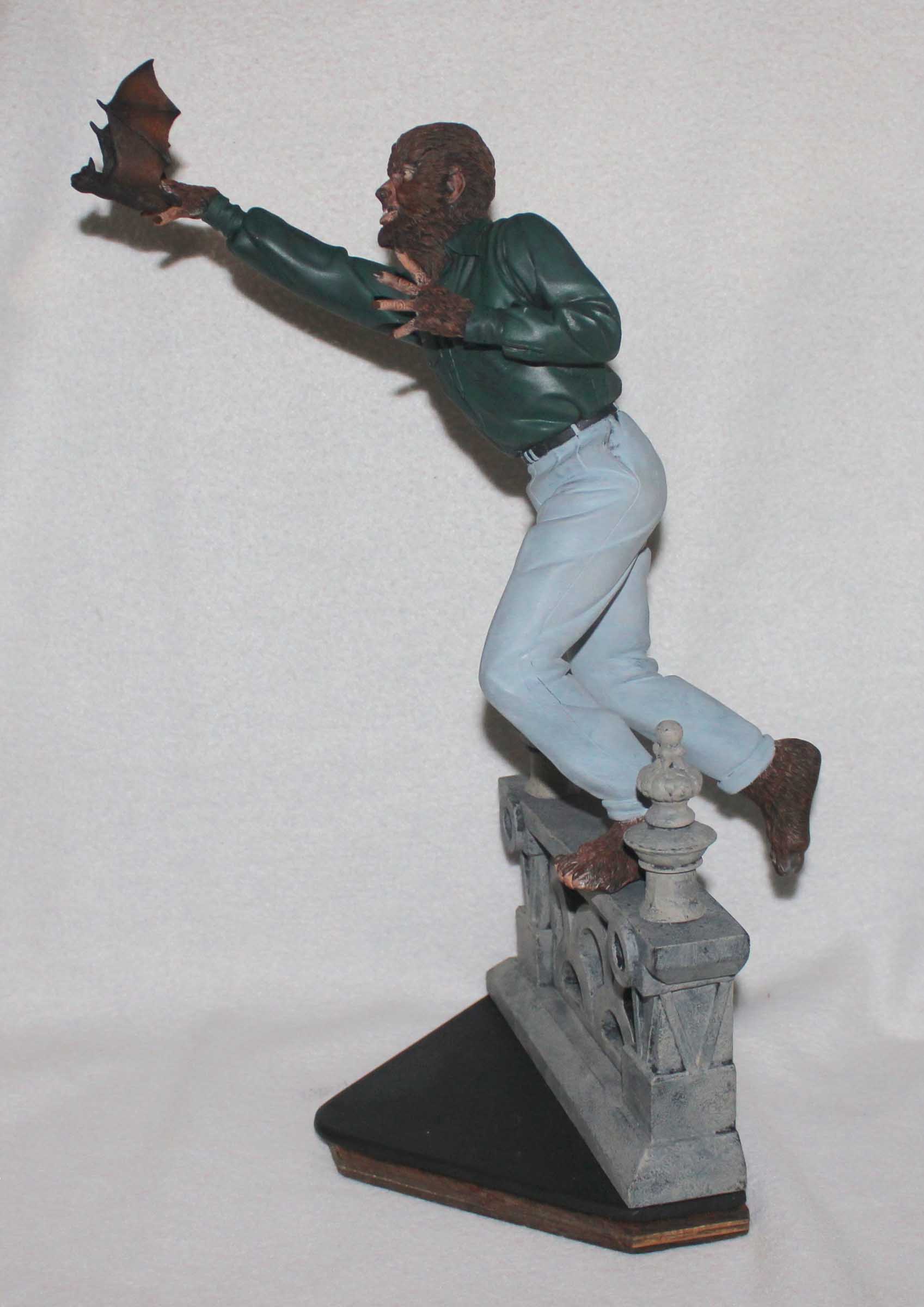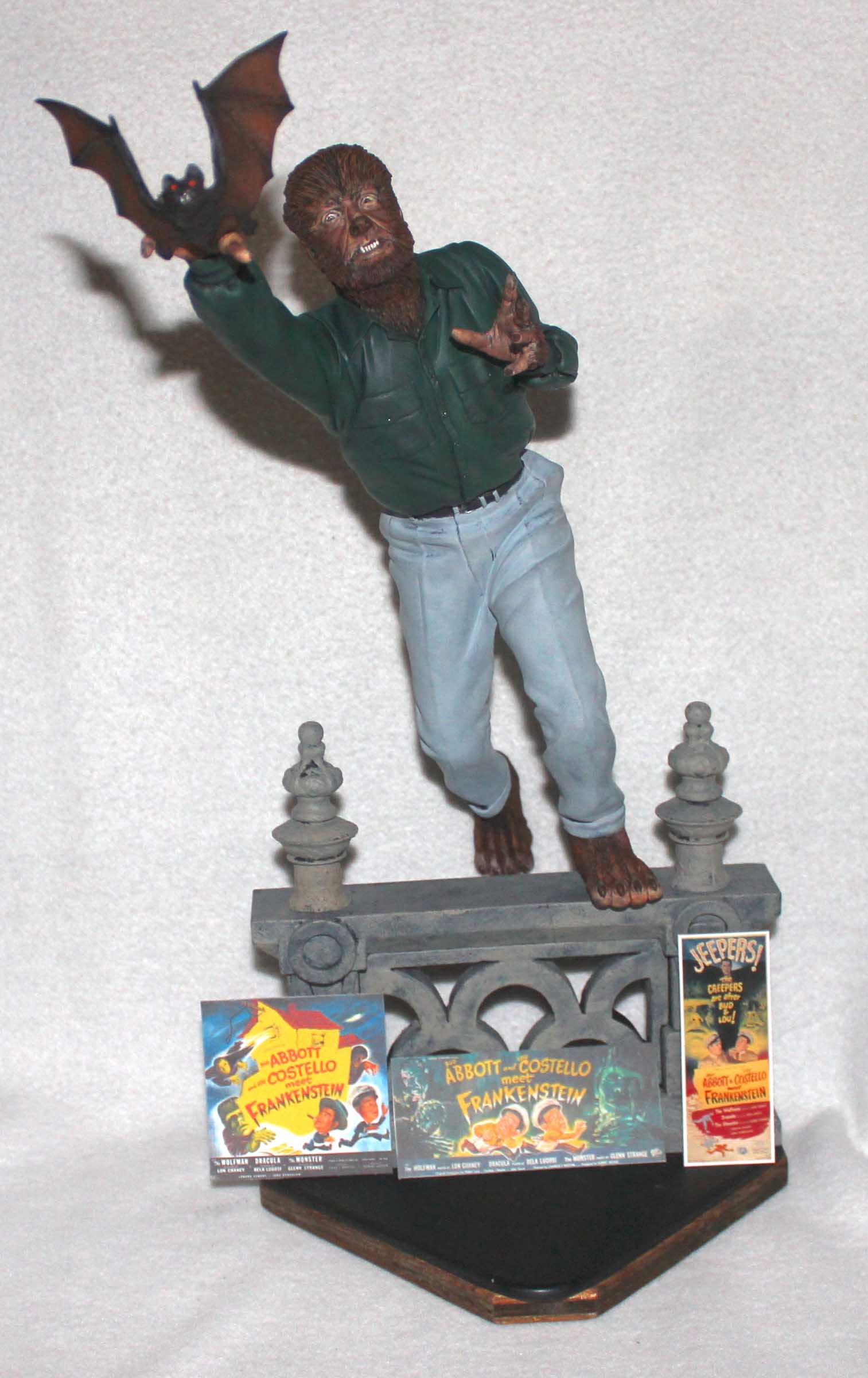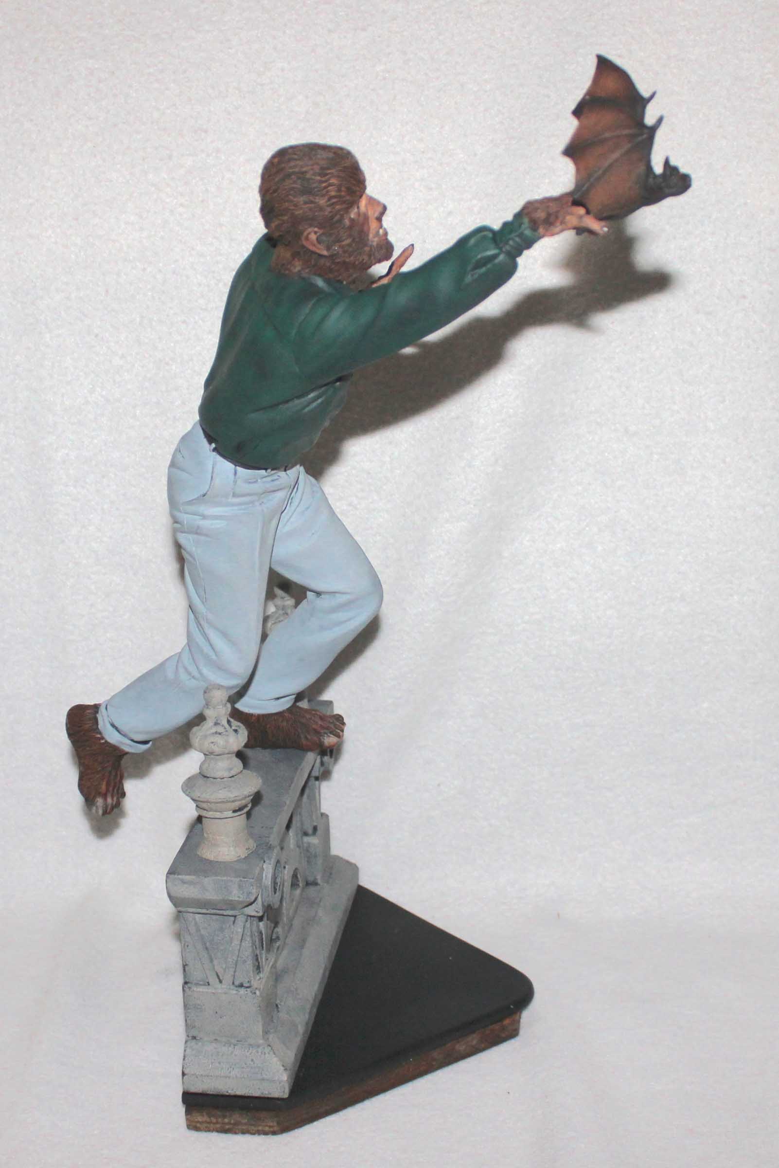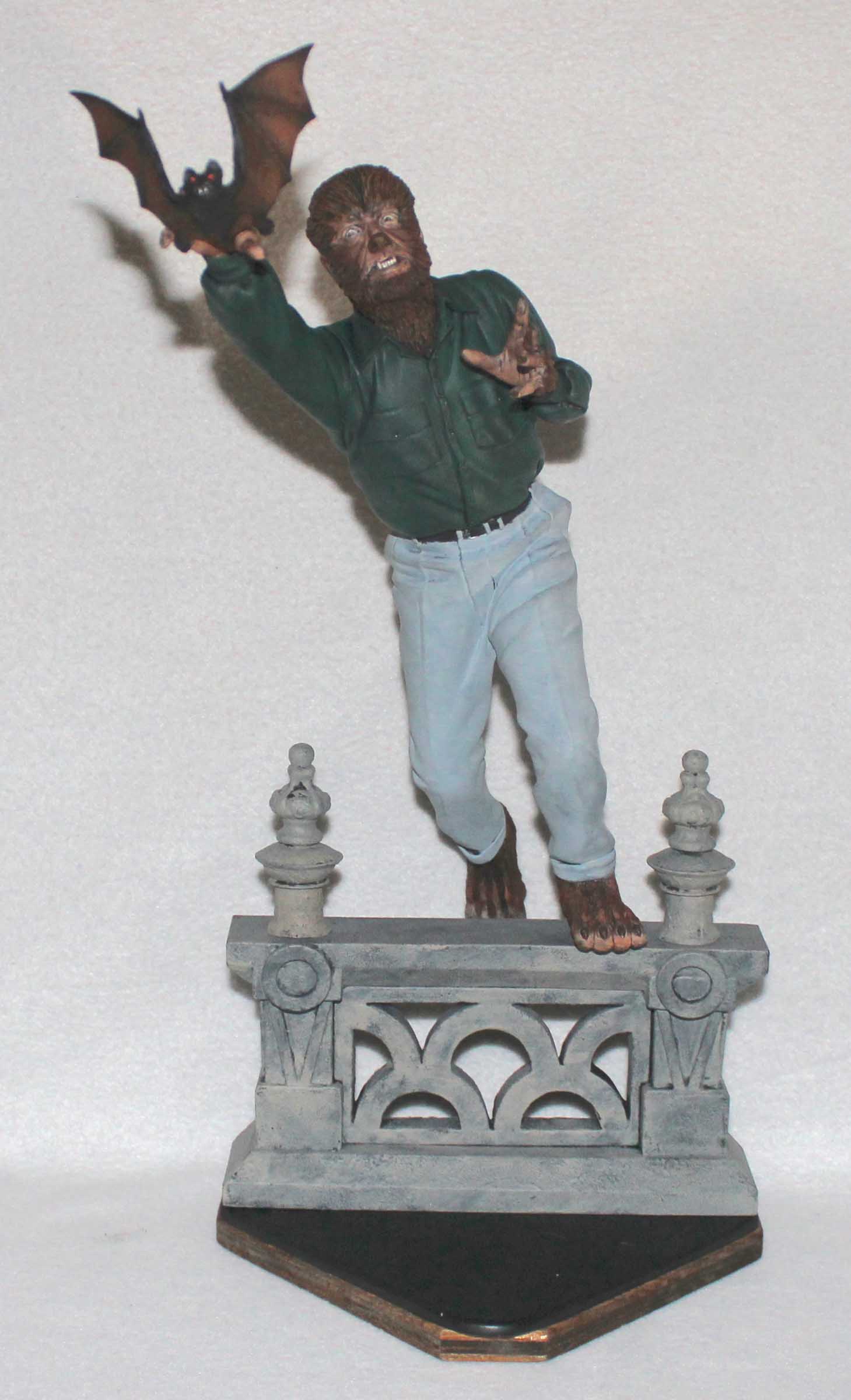 One of the last scenes in the film, Abbott & Costello Meet Frankenstein, is when the Wolf Man is chasing Dracula through the castle.  Dracula is at a balcony and turns into a bat.  The Wolf Man leaps off the balcony to grab the bat and thusly both plunge into the sea, fate unknown.  This diorama was sculpted by Jeff Yagher and released by X-O Facto. All paints are acrylics.