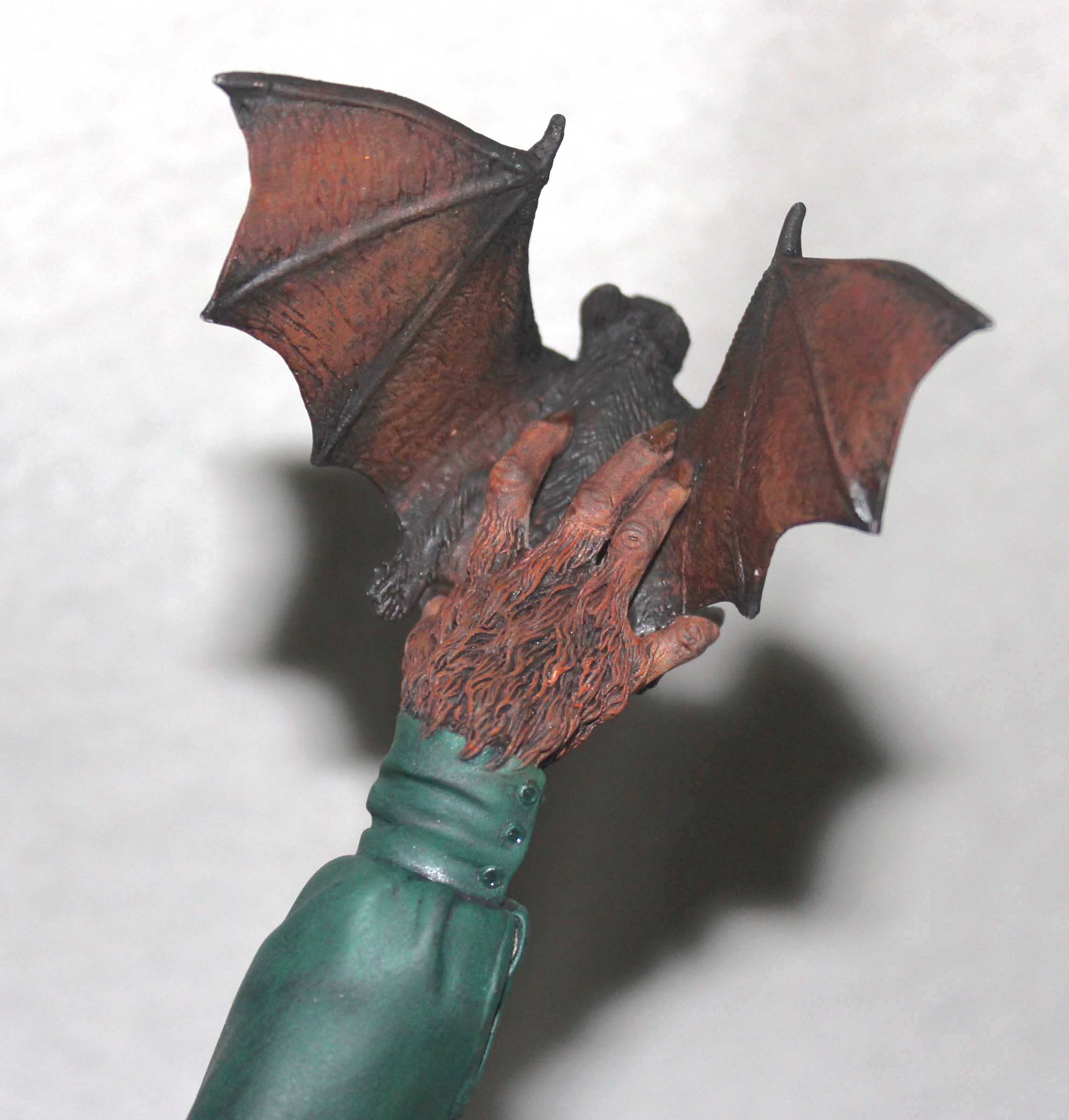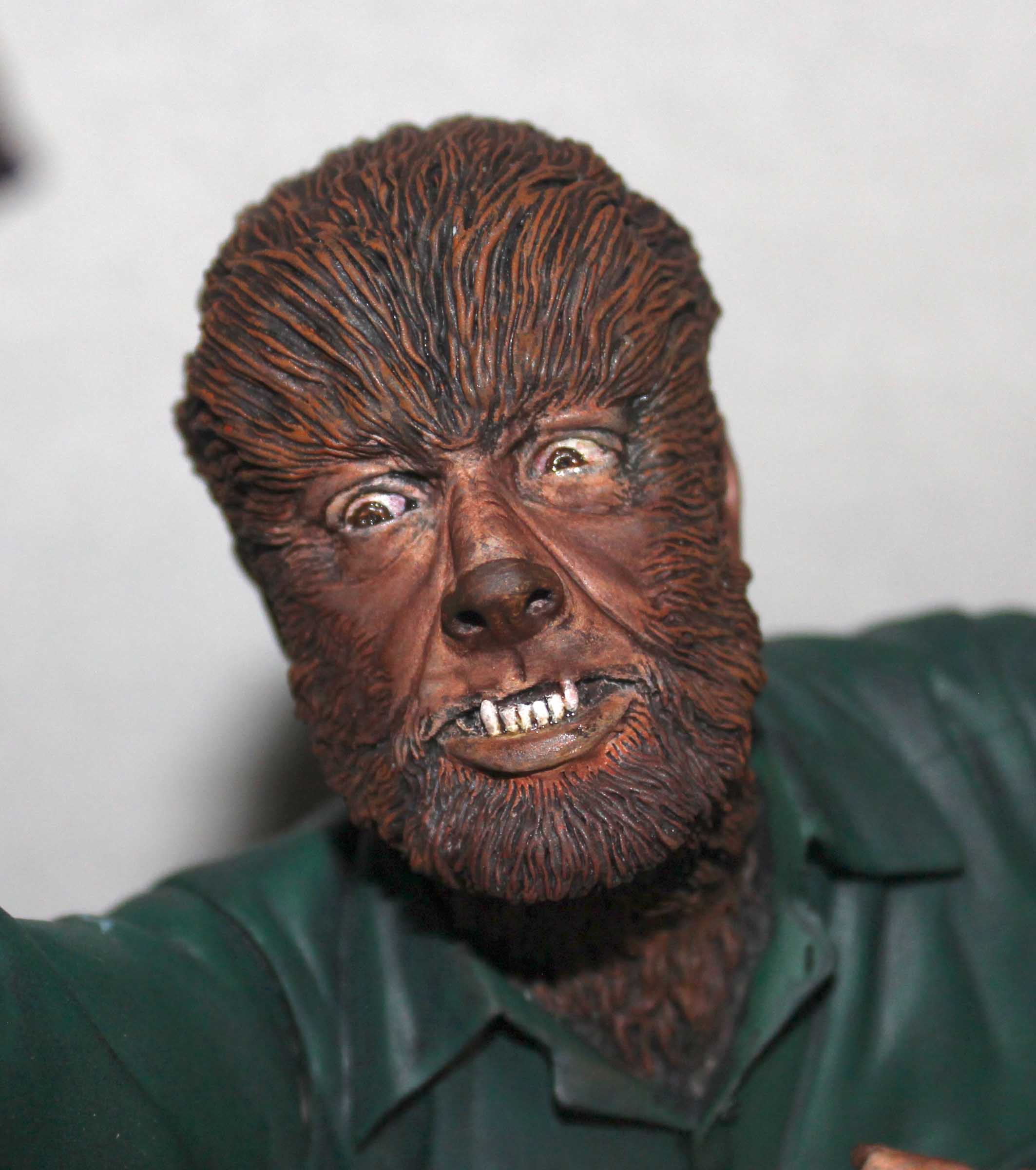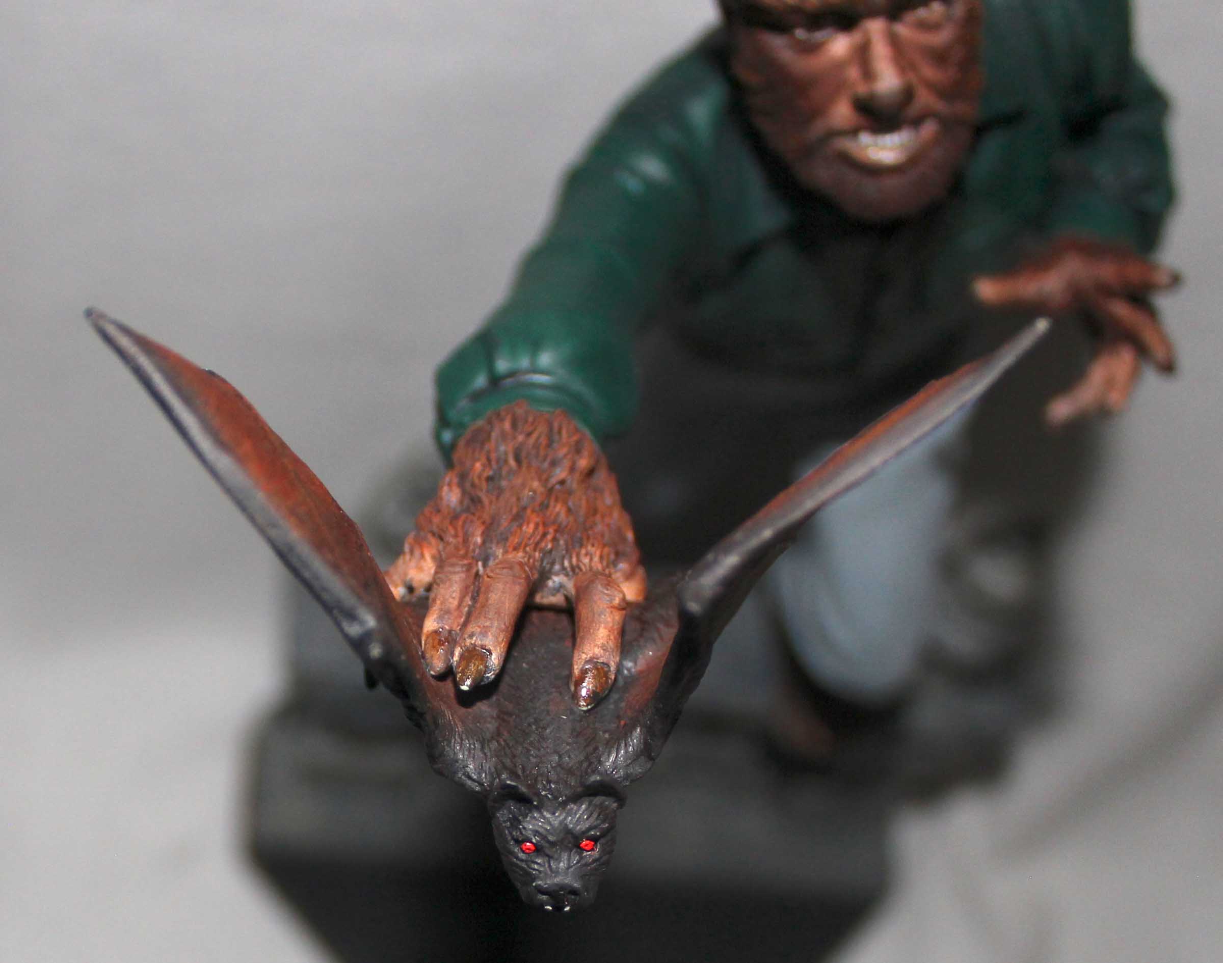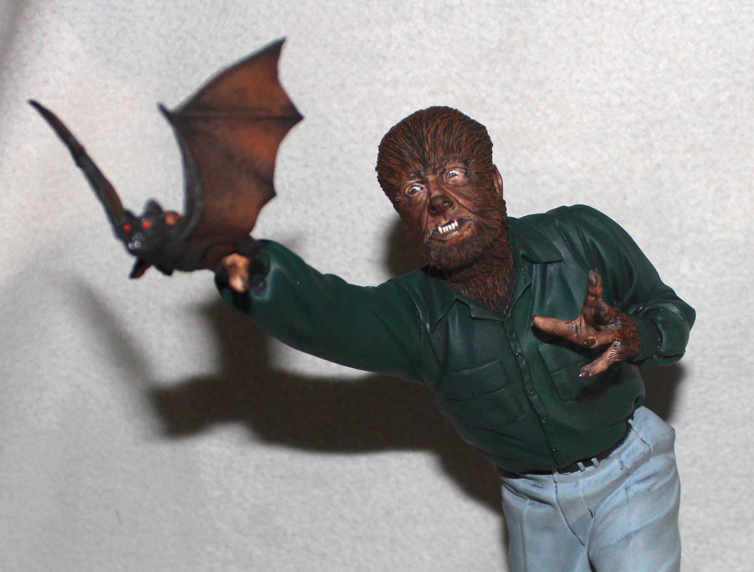 One of the last scenes in the film, Abbott & Costello Meet Frankenstein, is when the Wolf Man is chasing Dracula through the castle.  Dracula is at a balcony and turns into a bat.  The Wolf Man leaps off the balcony to grab the bat and thusly both plunge into the sea, fate unknown.  This diorama was sculpted by Jeff Yagher and released by X-O Facto. All paints are acrylics.