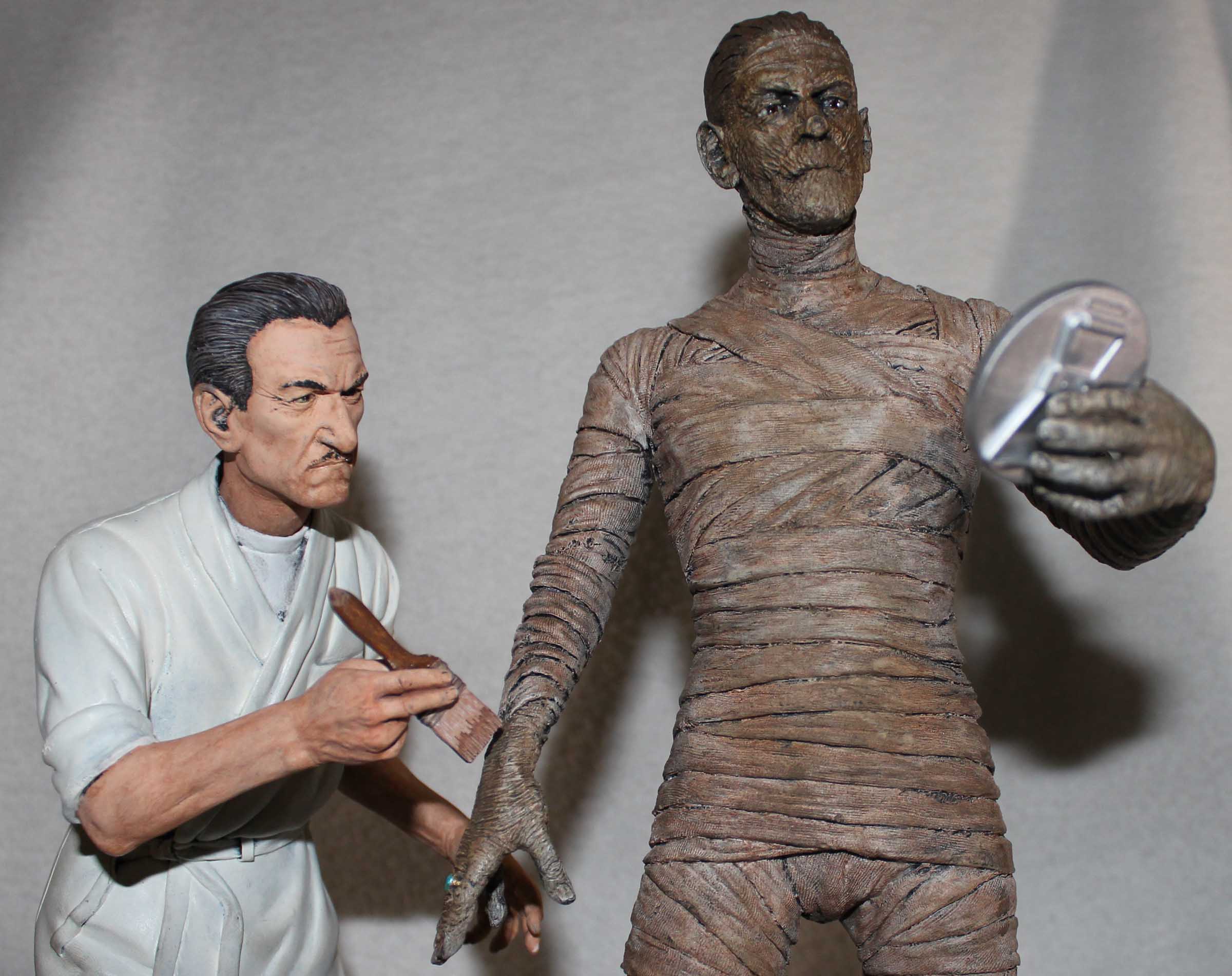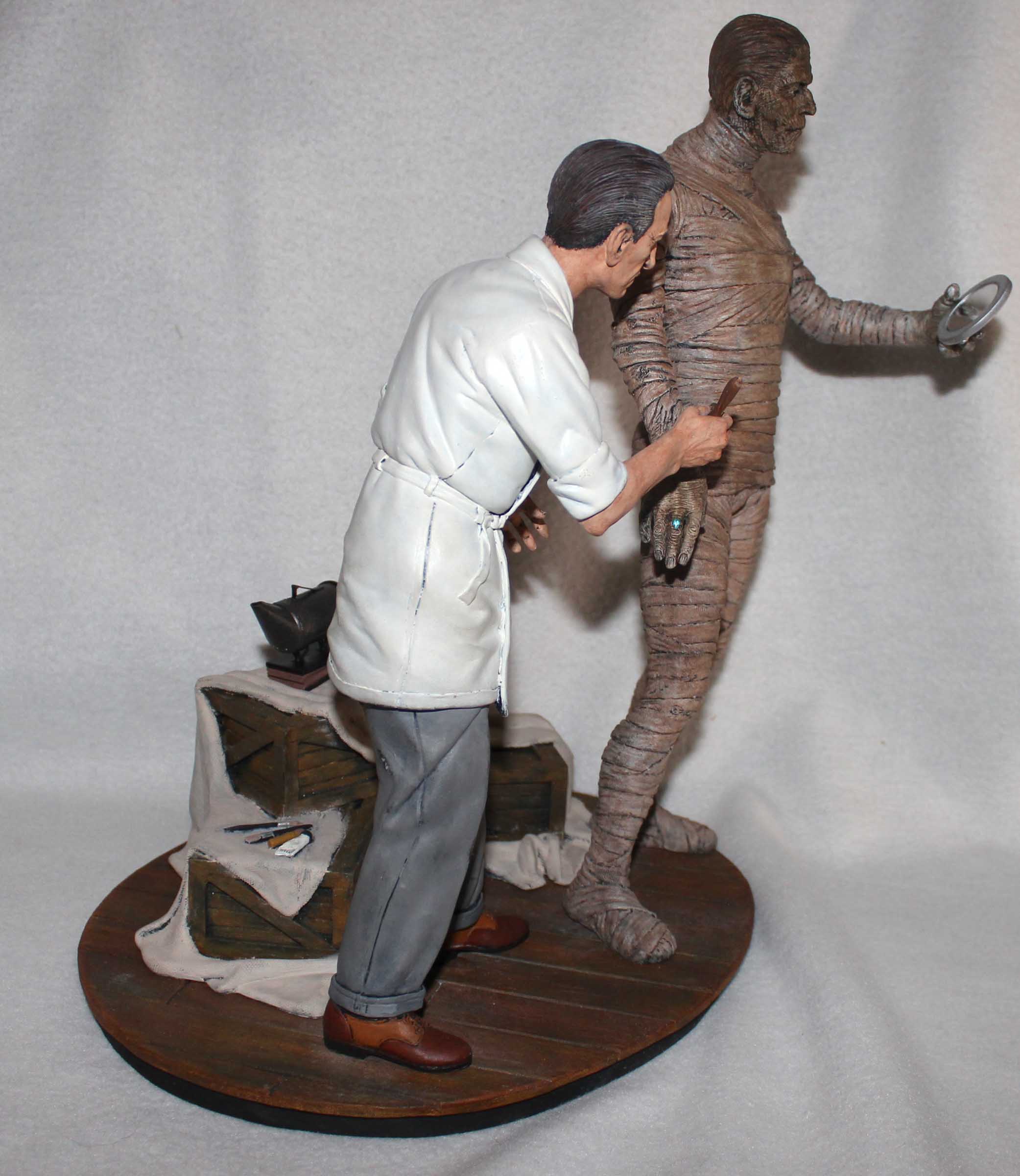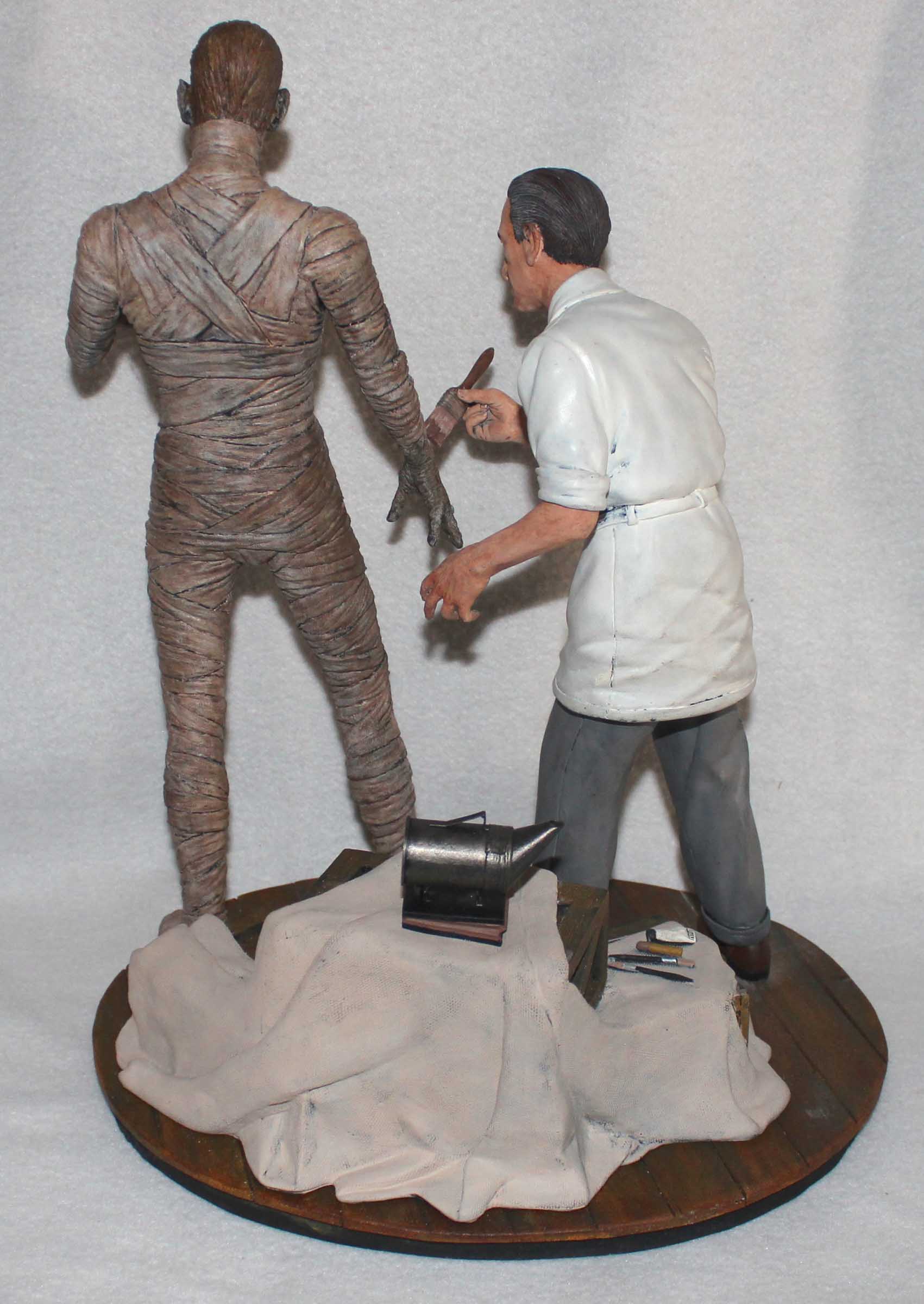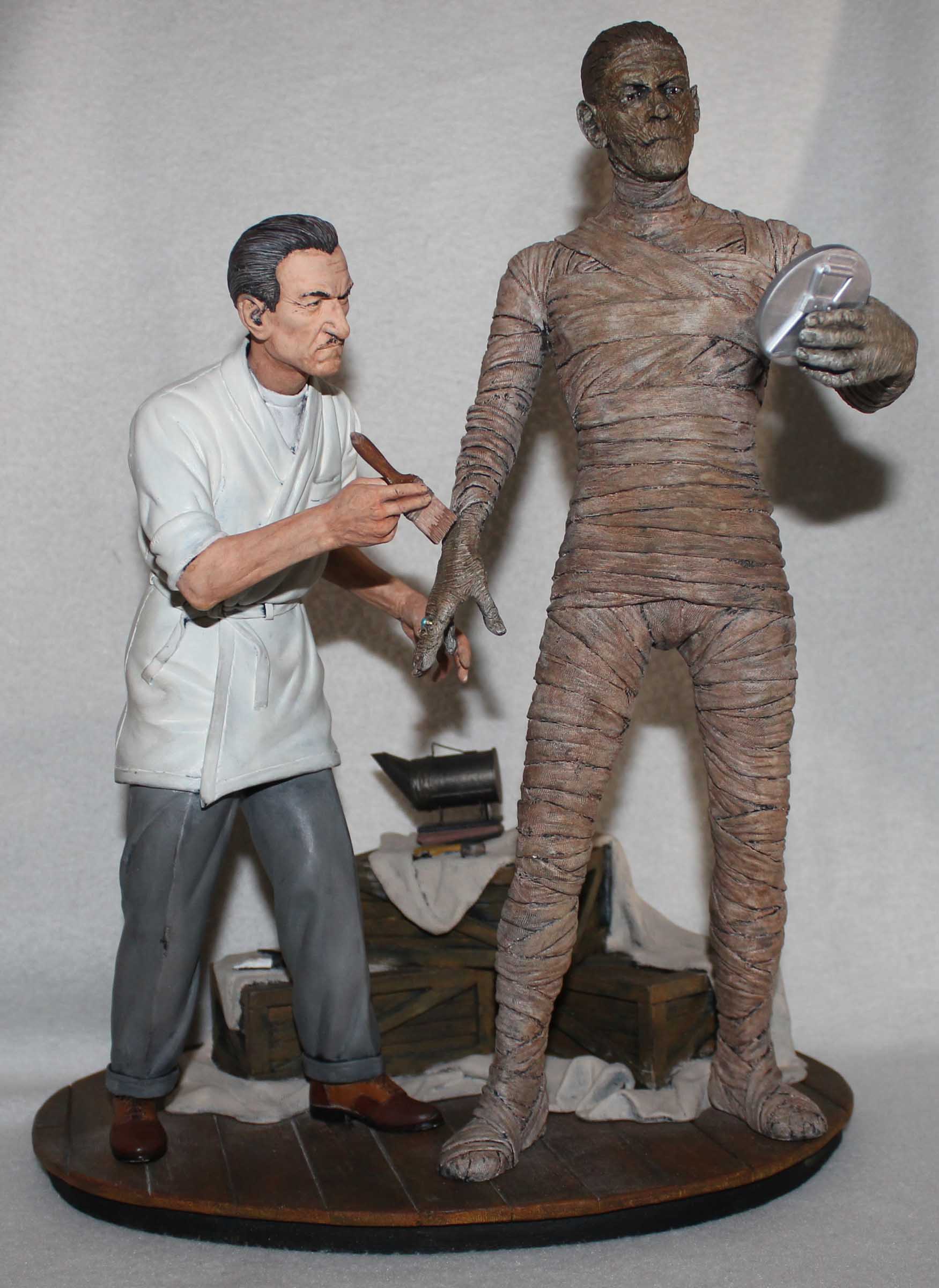 A few years ago Mike Hill created a life-sized version of Jack Pierce making up Boris Karloff for the Universal Studios film, The Mummy, which was shown at a Monsterpalooza show. Inspired by this image Jeff Yagher created an all-resin 1/6th scale version of Pierce adding some final touches to Karloff’s mummy makeup. This diorama is referred to as ‘Karloff and Pierce II’. Karloff is checking the results with his mirror. Pierce used a bee smoker to add dust and dirt to the mummy which is shown on the crates. Included with the diorama is a stela which serves as a nameplate. All paints are acrylics.