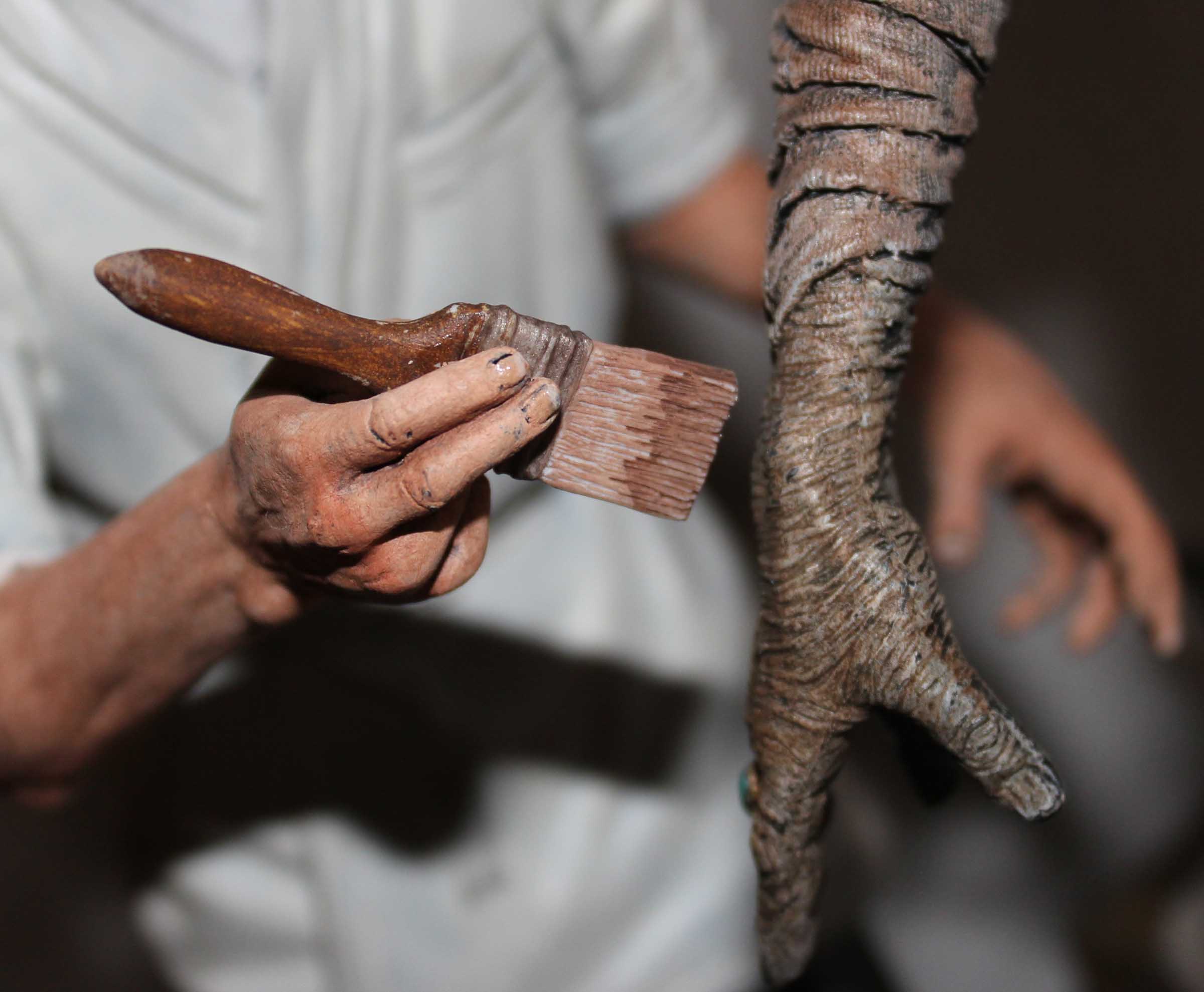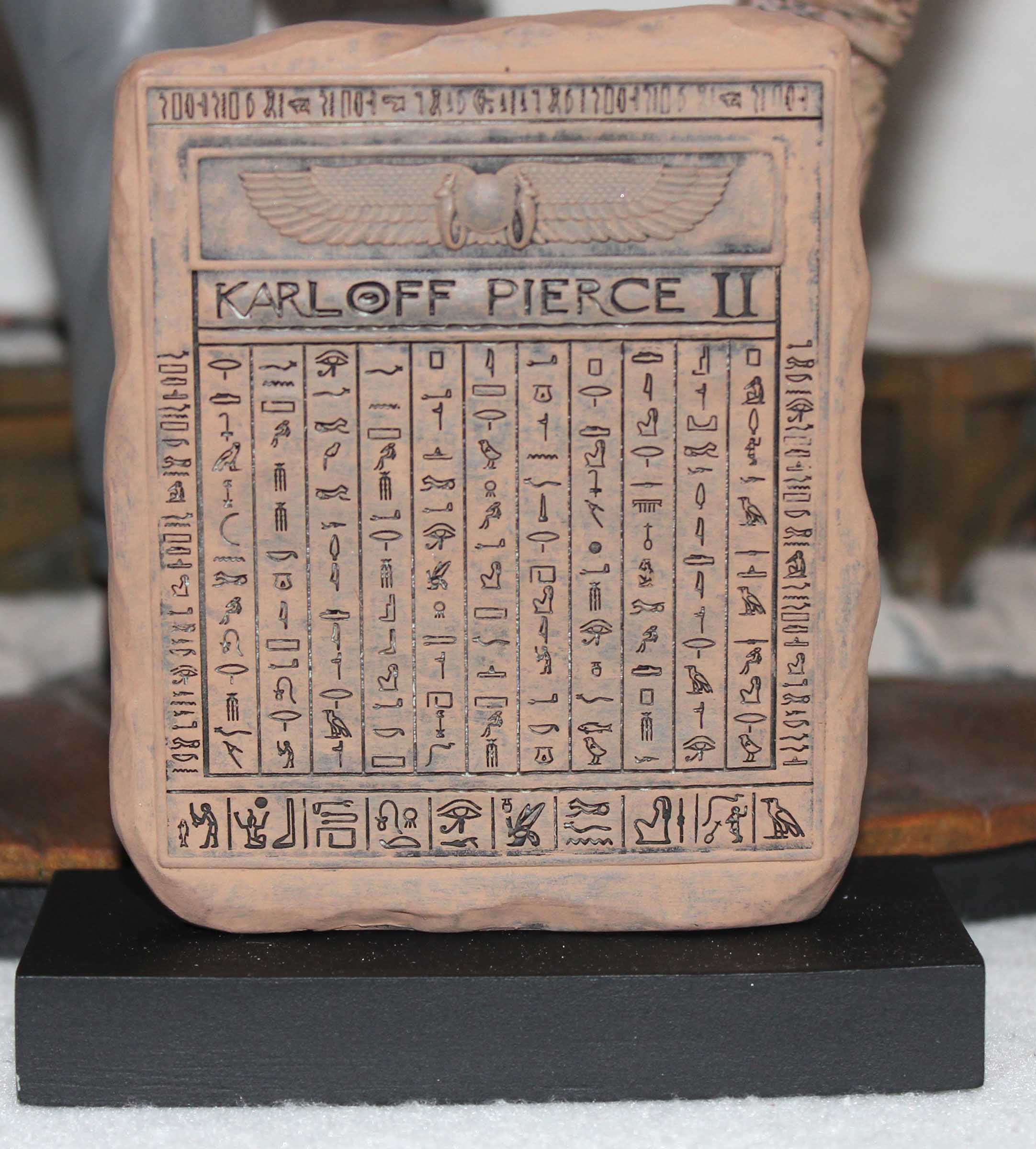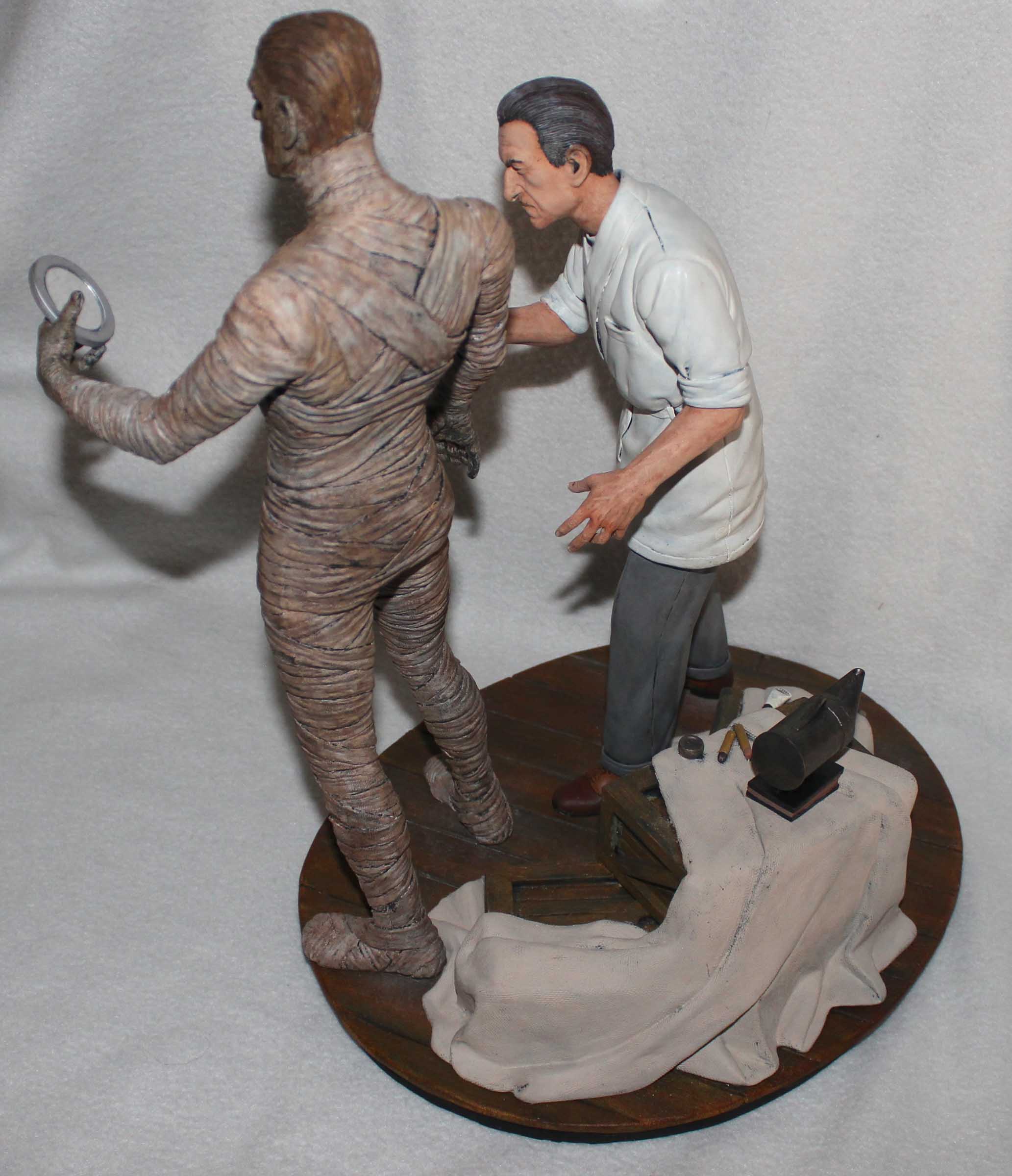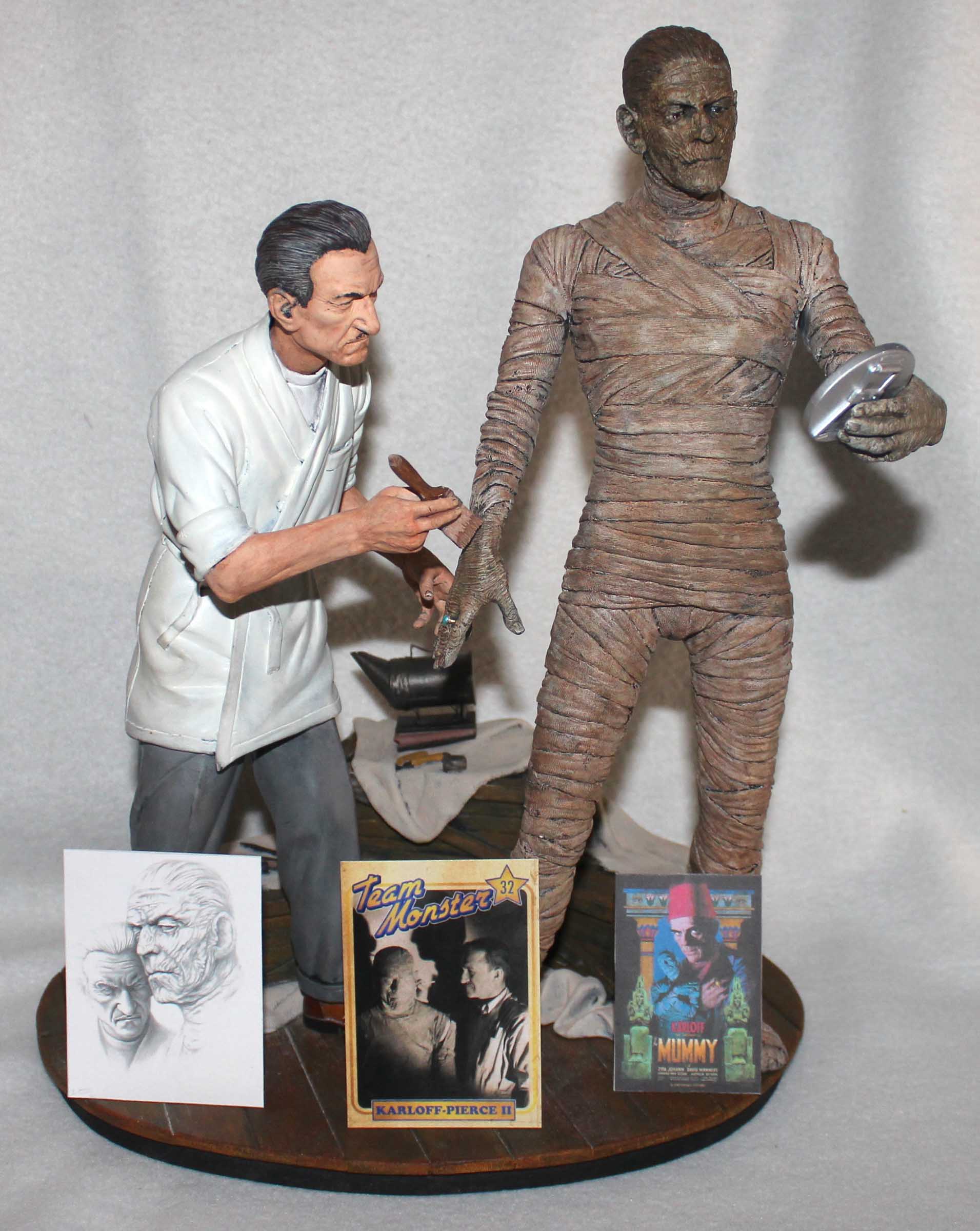 A few years ago Mike Hill created a life-sized version of Jack Pierce making up Boris Karloff for the Universal Studios film, The Mummy, which was shown at a Monsterpalooza show. Inspired by this image Jeff Yagher created an all-resin 1/6th scale version of Pierce adding some final touches to Karloff’s mummy makeup. This diorama is referred to as ‘Karloff and Pierce II’. Karloff is checking the results with his mirror. Pierce used a bee smoker to add dust and dirt to the mummy which is shown on the crates. Included with the diorama is a stela which serves as a nameplate. All paints are acrylics.